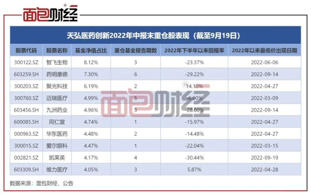从2022年中报末重仓股的后续表现来看,多只股票价格在继续下探,如药明康德、九洲药业、凯莱英近期仍在更新年内最低股价。另外,多只重仓股自下半年以来股价跌幅超过20%。