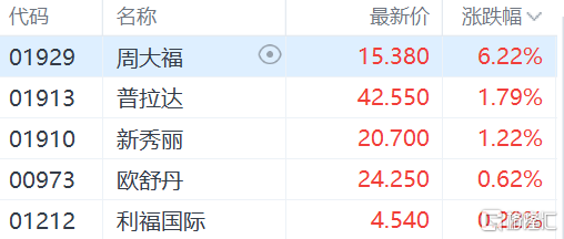 香港零售股逆势走强。周大福涨超6%,普拉达、新秀丽、欧舒丹等个股跟涨。