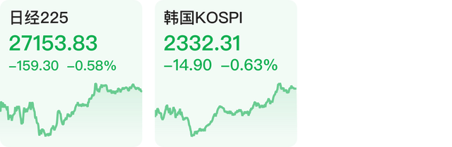 日经225指数跌0.58%,韩国KOSPI指数跌0.63%。
