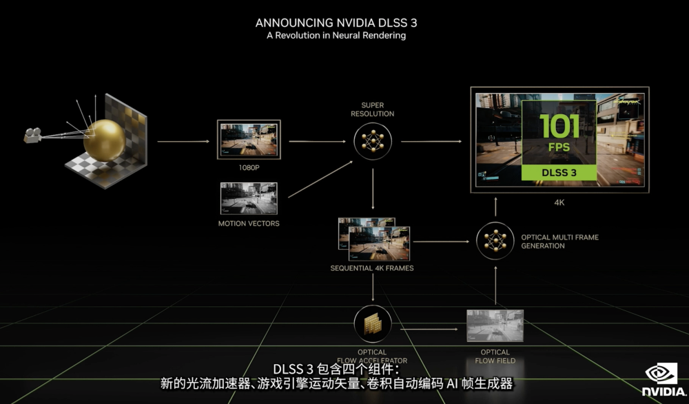 关于RTX 4090搭载的DLSS 3,黄仁勋介绍称,这款基于深度学习的超分辨率技术,其由全新第四代 Tensor Core 和 GeForce RTX 40 系列 GPU 的全新光流加速器驱动,是 NVIDIA 广受好评的深度学习超级采样技术的最新版本,并拥有开创性的光学多帧生成功能。