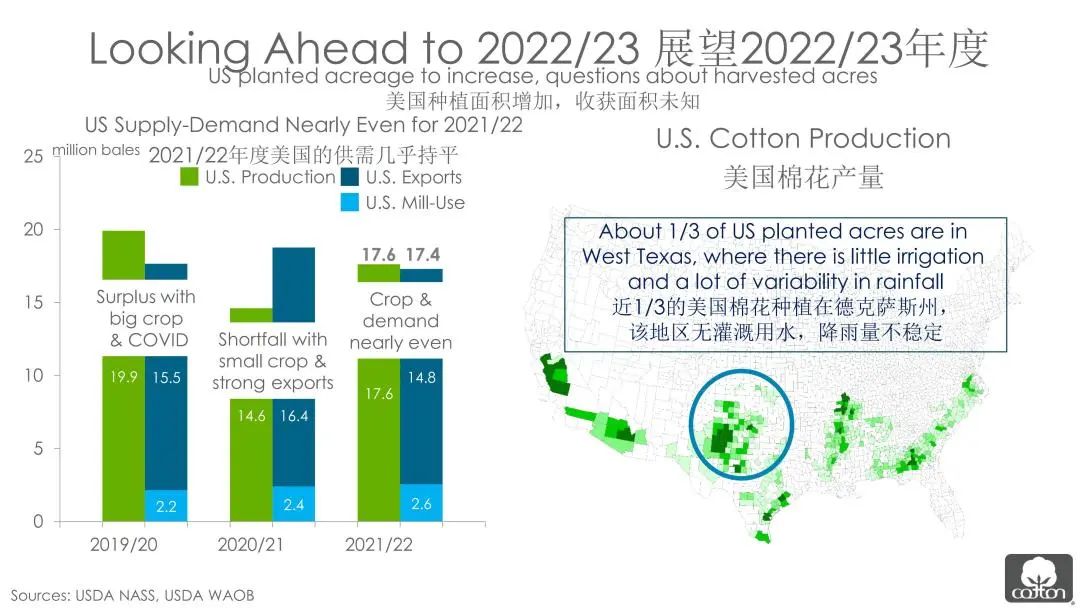 通货膨胀和利率上升将使需求放缓,这将带来的一个积极影响是物流业可能得以恢复。物流问题的解决可以缓解价格的上行压力。“随着棉花市场和宏观经济条件的不断演变,不确定性仍然是市场的主基调。”傅培花强调道。