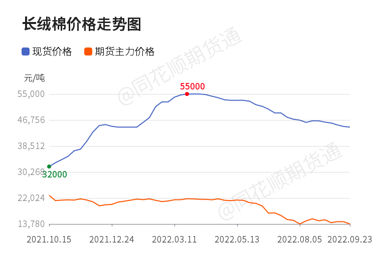 长绒棉现货9月30日当周已跌至43600.00元/吨,周跌幅2.02%,月跌幅5.42%。