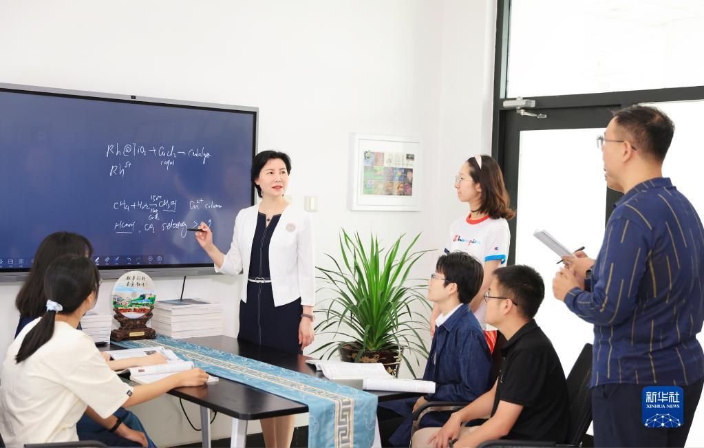 于吉红(中)与学生在一起讨论(2022年8月16日摄)。新华社发