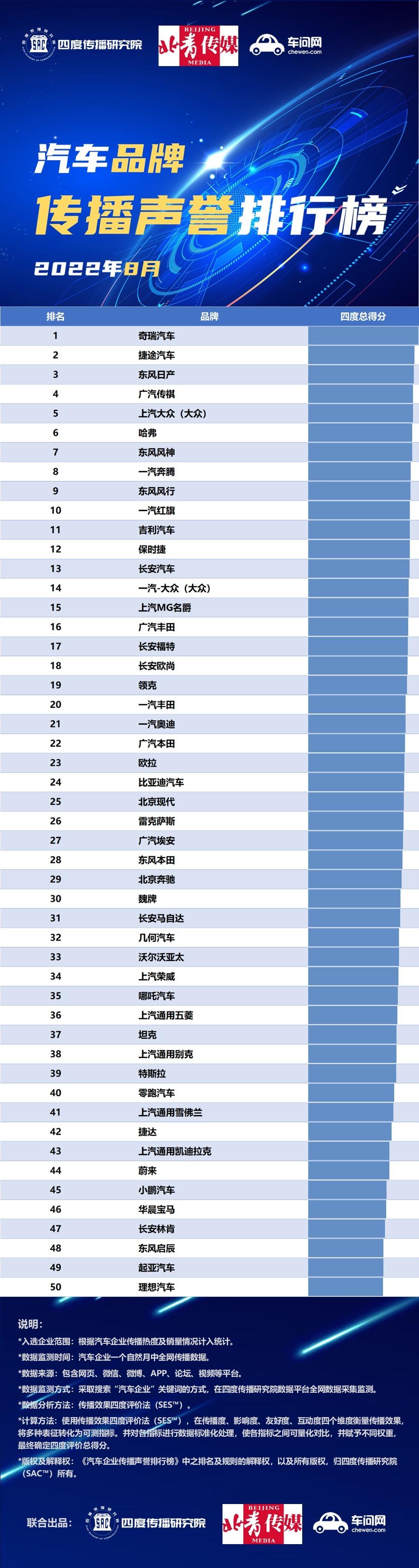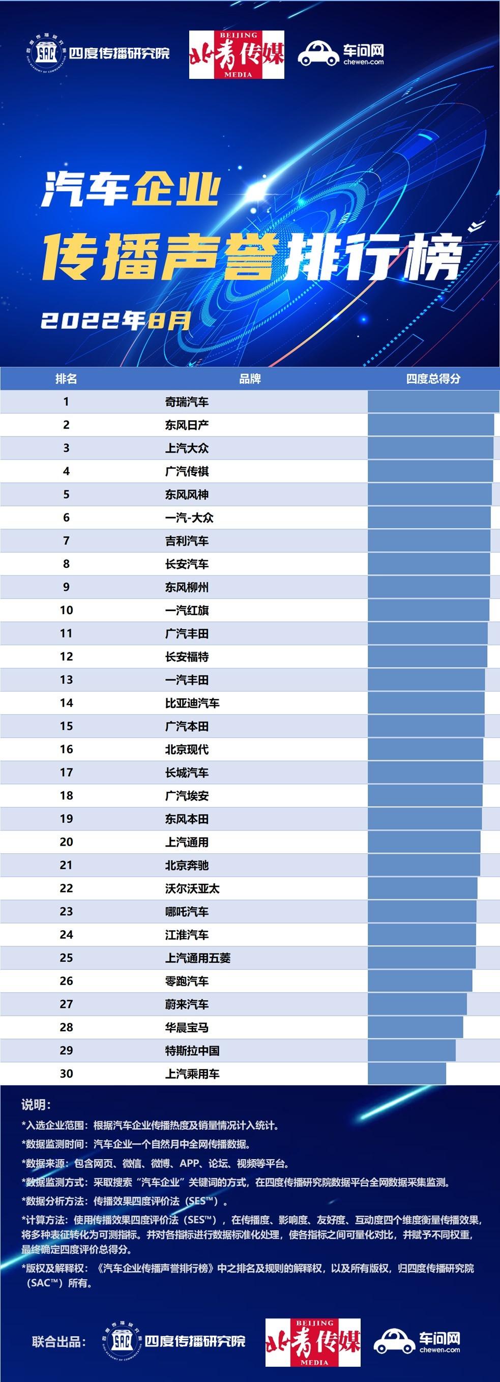 【天天焦点】8月汽车企业/品牌传播声誉排行榜发布 奇瑞汽车获双榜冠军