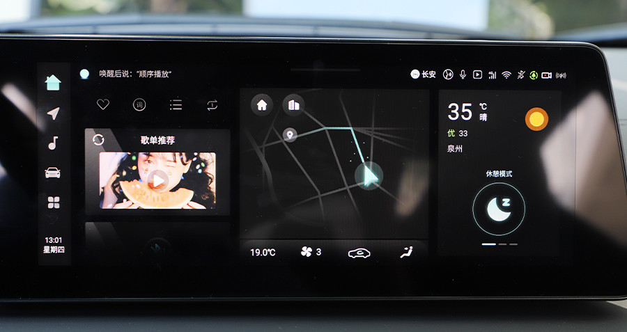 在科技氛围上,7英寸高清全液晶仪表+12.3英寸多媒体屏幕组成的双联屏最先引入眼帘,整体显示效果以及UI设计简洁易懂。使用体验来说,地图导航反应快速,智能语音助手通过“你好,小安”可唤醒,辨识度很高,日常音乐、空调等也能快速做出反应。该车机内置8666平台高性能硬件及飞鱼2.5生态系统,虽不是目前主流的8155芯片,但就长安旗下车型近几年的表现来看,整体在软件方面的调校水准来看,不会让人失望。