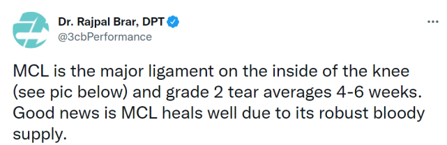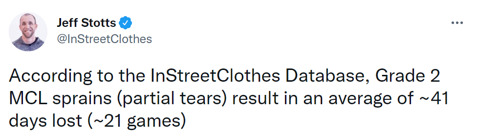 两位医学专家也对亚历山大的伤情进行解读。专家Brar表示,内侧副韧带二级扭伤平均康复时间是4-6周。好消息是这一位置的供血充足,有利于康复速度。专家Strotts表示,数据显示,内侧副韧带二级扭伤(部分撕裂)在NBA平均康复时间是41天,换算成比赛,就是大约21场比赛。不过,亚历山大不是在赛季期间受伤,预计不会错过那么多场比赛。