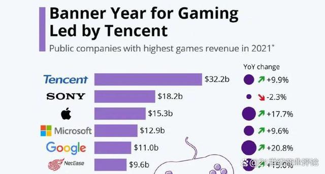 在全球市场,Statista数据显示,2021年,腾讯游戏收入为322亿美元(约合人民币2248亿元),超过索尼、苹果。据IT桔子,腾讯游戏市占率高达16.7%。
