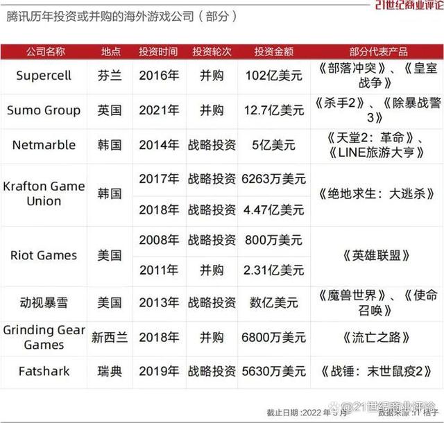 据中信证券研究报告,自2012年以来,腾讯至少耗费978.67亿元,投资了33家海外游戏公司,包括开发《英雄联盟》的拳头公司、开发《皇室战争》的Supercell。考虑到样本遗漏,其整体投资额当在千亿之巨。